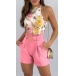 This stylish two-piece set features a floral printed shirt paired with matching printed shorts and a coordinating belt. The lightweight, breathable fabrics ensure comfort and ease of wear, making this two-piece set ideal for warm weather occasions.