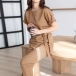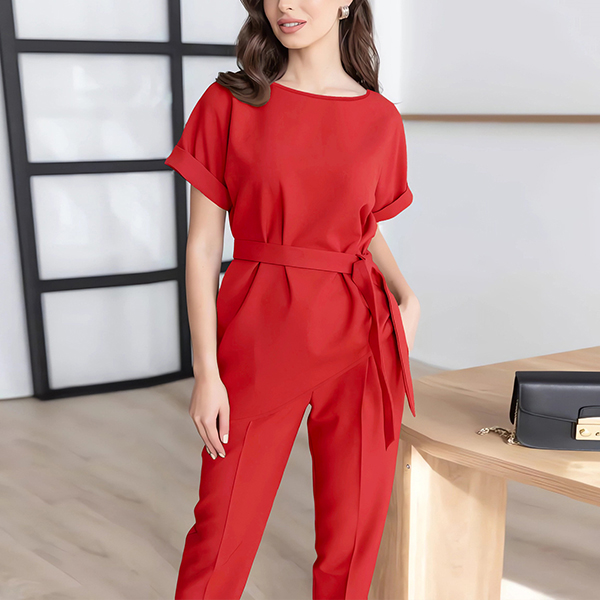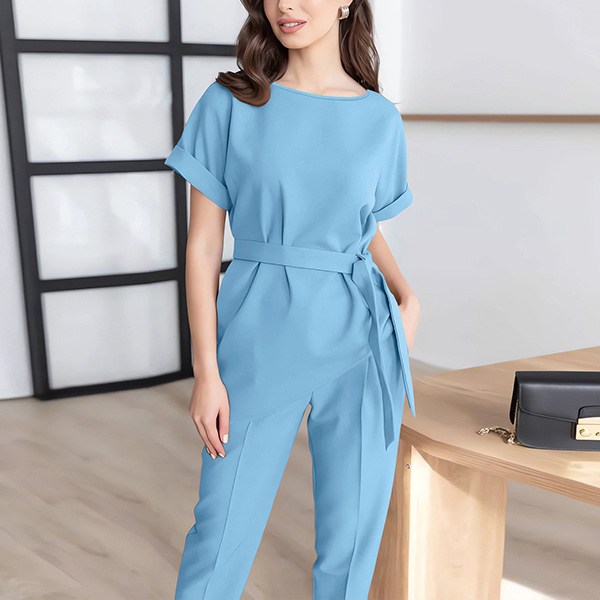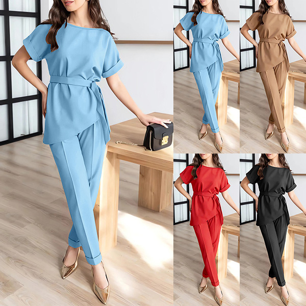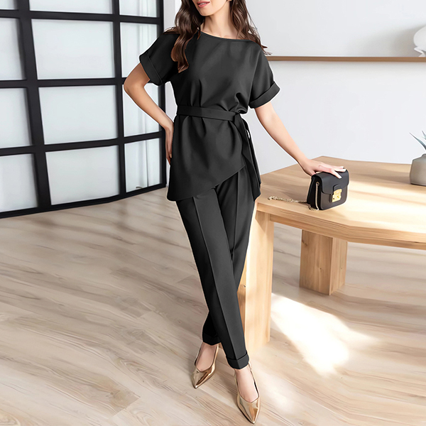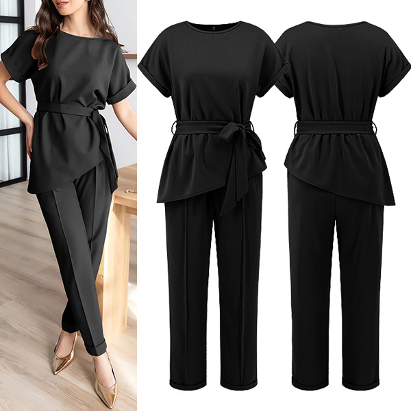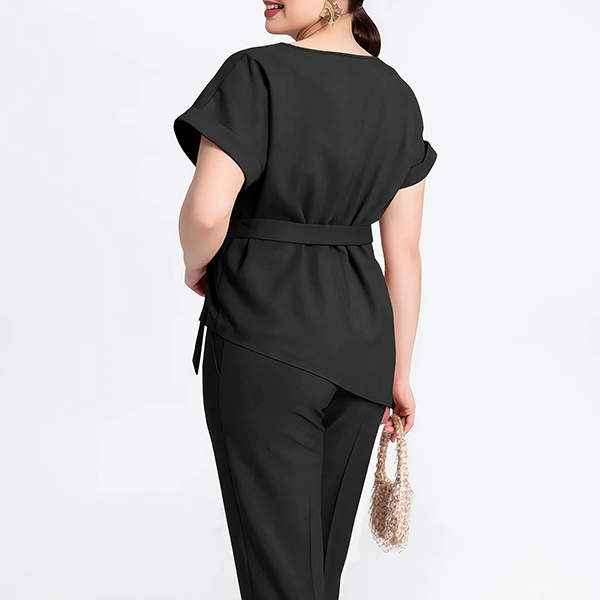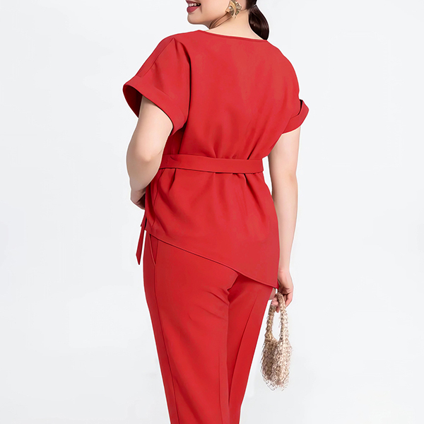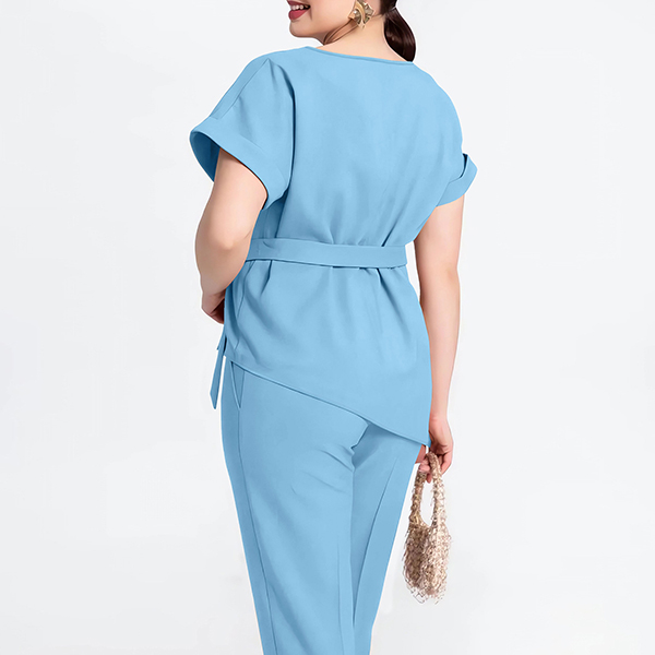 This set offers a stylish and coordinated ensemble, featuring an eye-catching irregular hemline shirt and matching pants that exude modernity and flair.