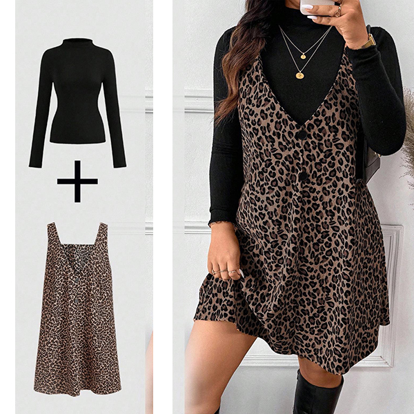 This striking two-piece set features bold leopard printed suspender dress paired with classic black shirt for sophisticated contrast styling. The leopard print brings wild elegance whilst the black shirt provides refined balance with coordinated sophistication. Perfect for casual weekend styling, fashion-forward occasions, or contemporary layered looks. Wanna have a try?