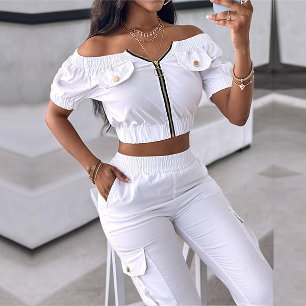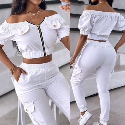 Fashion Two-piece Set Consist of Off-the-shoulder Crop Top and Slim-fit Pants with Side Patch Pockets