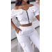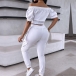 This chic two-piece set features an alluring off-the-shoulder crop top paired with figure-flattering slim-fit pants for a coordinated, stylish look.