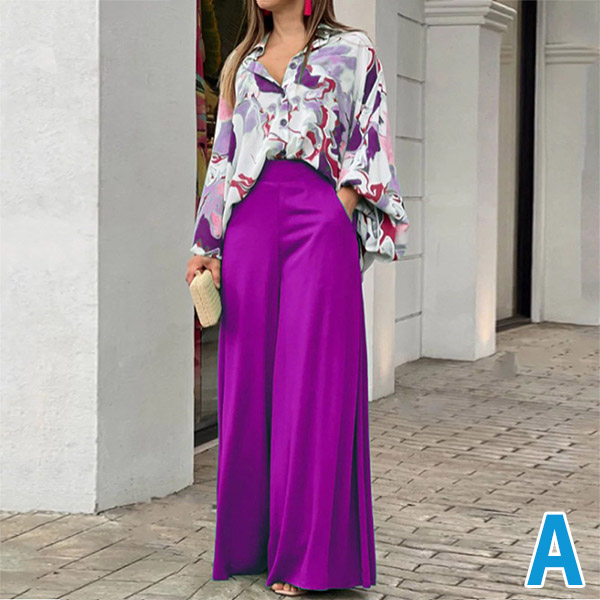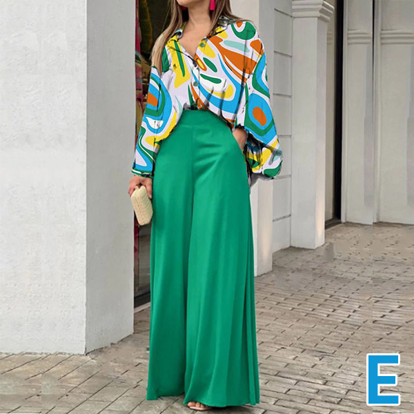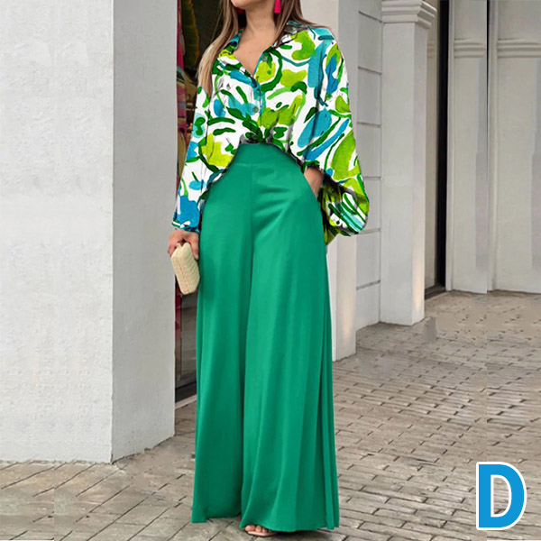Fashion Two-piece Set Consist of Red Floral Printed Long Sleeve Shirt and Green Wide-leg Pants