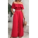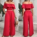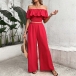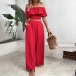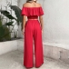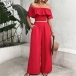 This red two-piece set consists of a smocked crop top and wide-leg pants, offering a trendy and coordinated look that is both stylish and versatile. The crop top features a feminine and flirty ruffle off-the-shoulder design. And the pant with side pockets details. This set creates a chic and fashion-forward ensemble that is perfect for a variety of occasions.