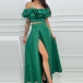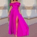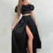 Look at this two-piece set! It consist of an off-the-shoulder crop top with ruffle details and a slit skirt. It is designed to create a stylish and feminine ensemble. Wanna have a try?