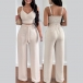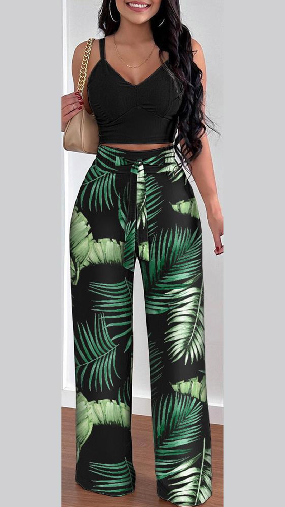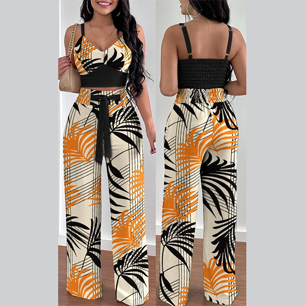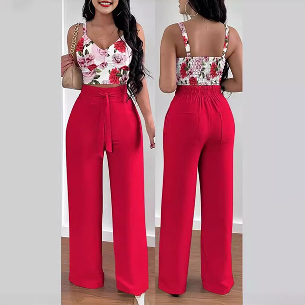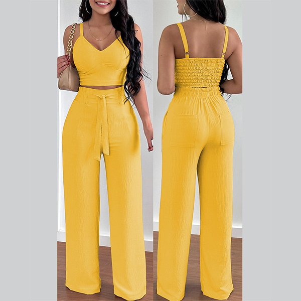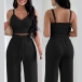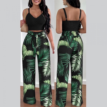 Fashion Two-piece Set Consist of Smocked Crop Top and Straight-cut Pants