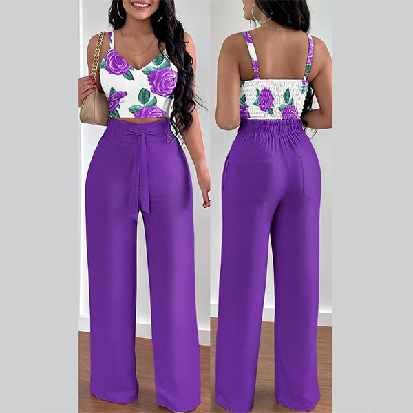 This stylish two-piece set combines a charming smocked crop top with sleek straight-cut pants, creating a modern, coordinated look perfect for a variety of occasions.