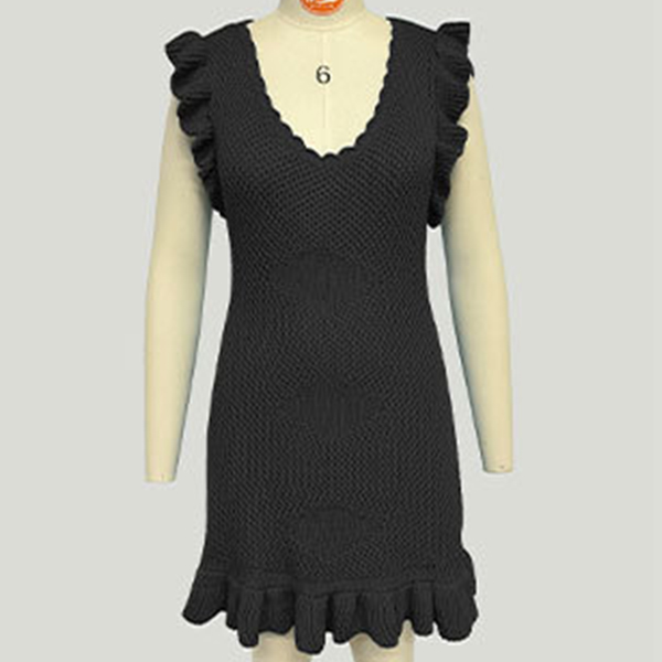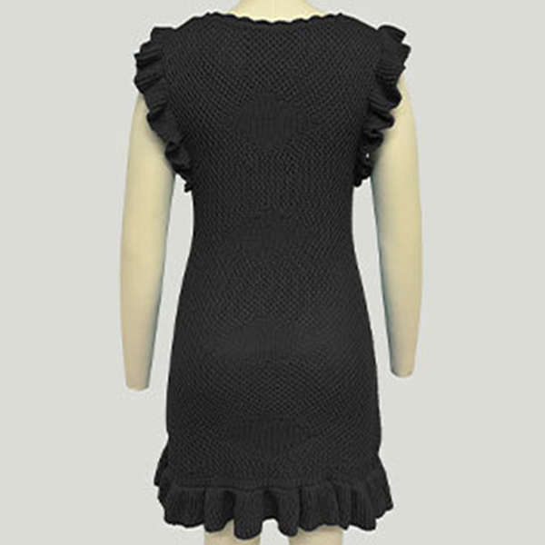 This dress features a U-shape neckline, ruffled sleeves and hemline, and a sleeveless silhouette for a fashionable and elegant look. The knitted material provides a cozy and soft feel while maintaining a polished and put-together appearance.