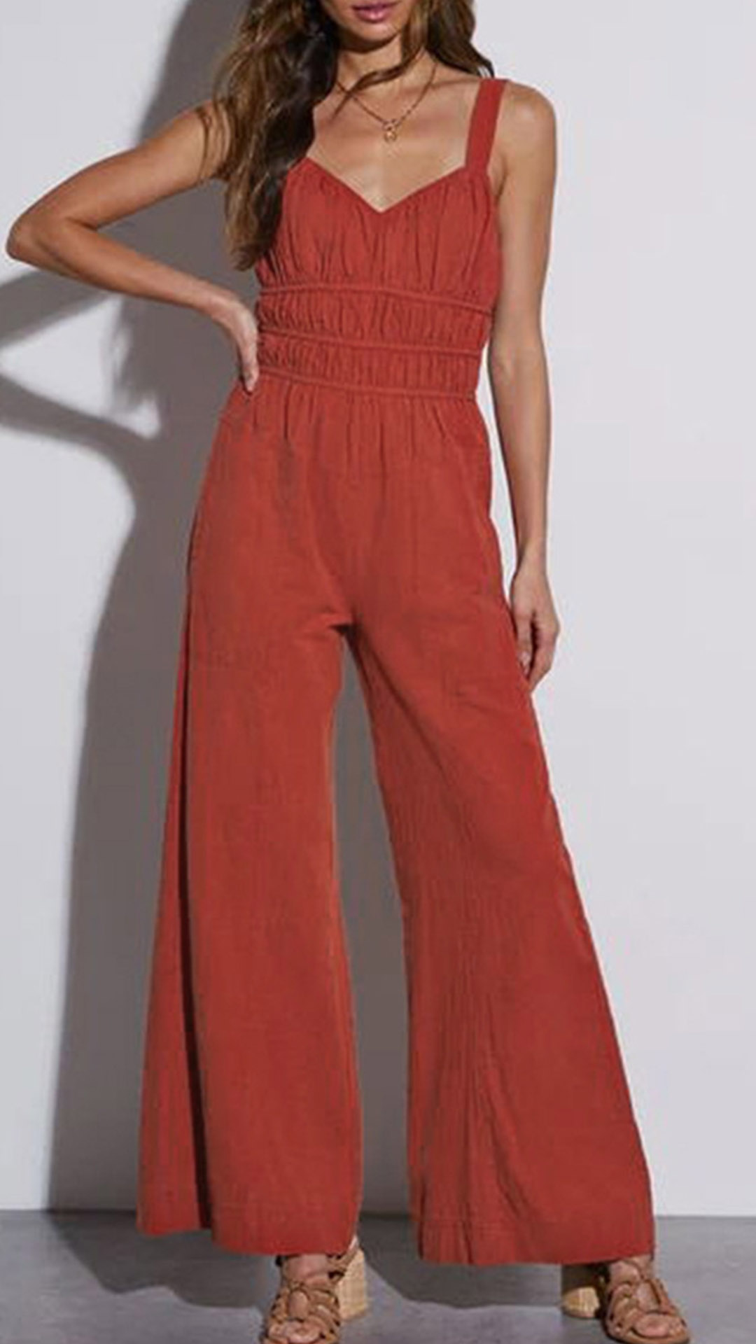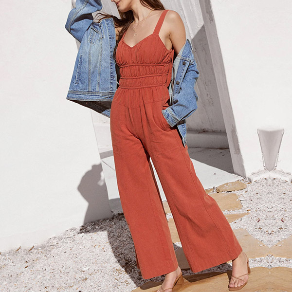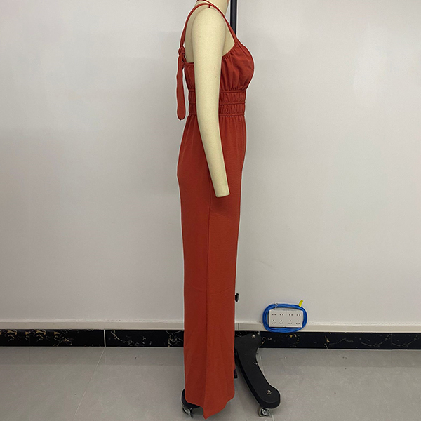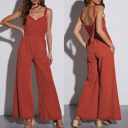 This fashionable jumpsuit features a V-neckline, backless, high-rise and wide-leg design, it is tylish and on-trend!