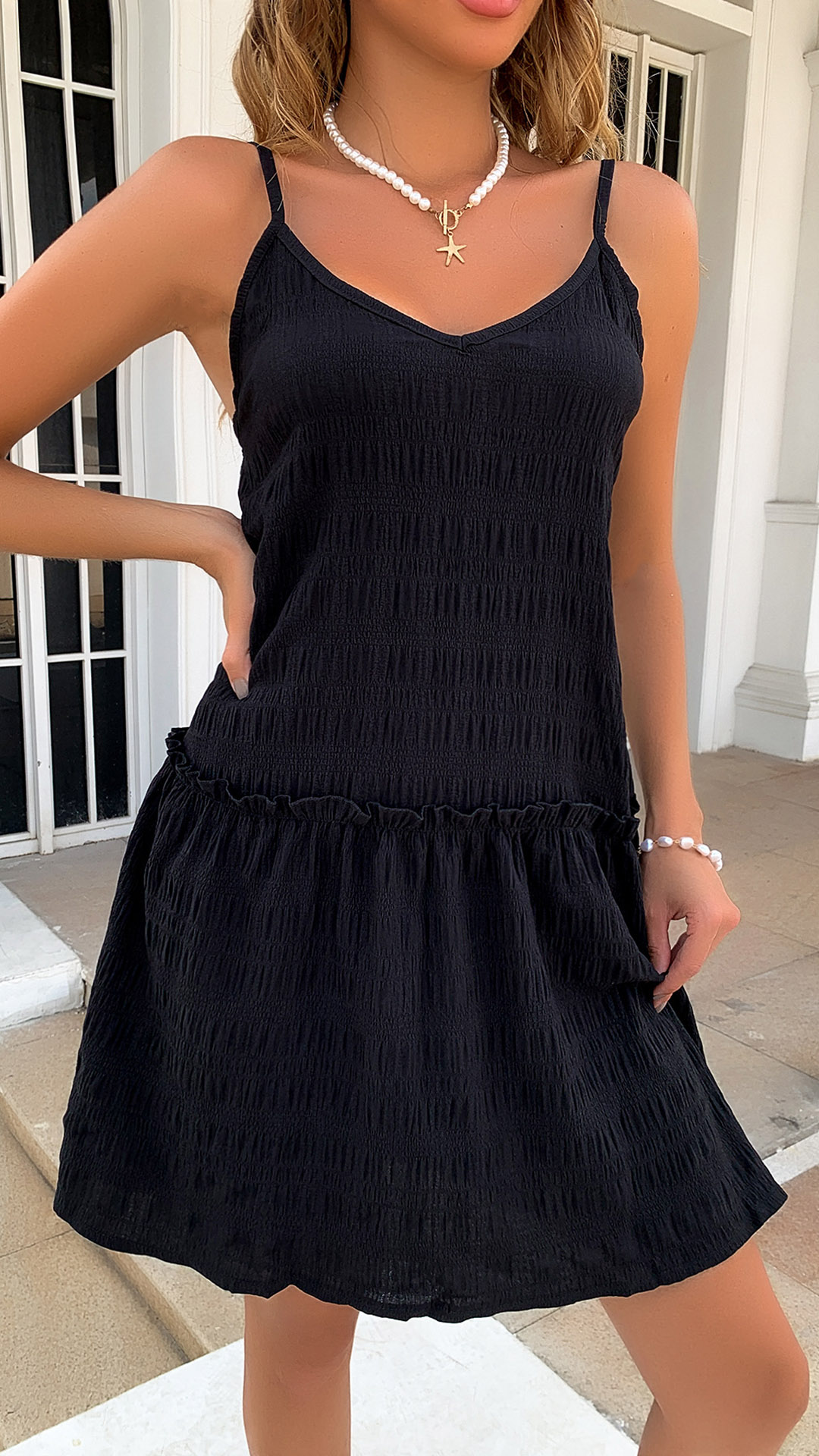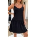 This black dress features a V-neckline, backless design, and tiered layers for a chic and trendy look.