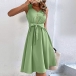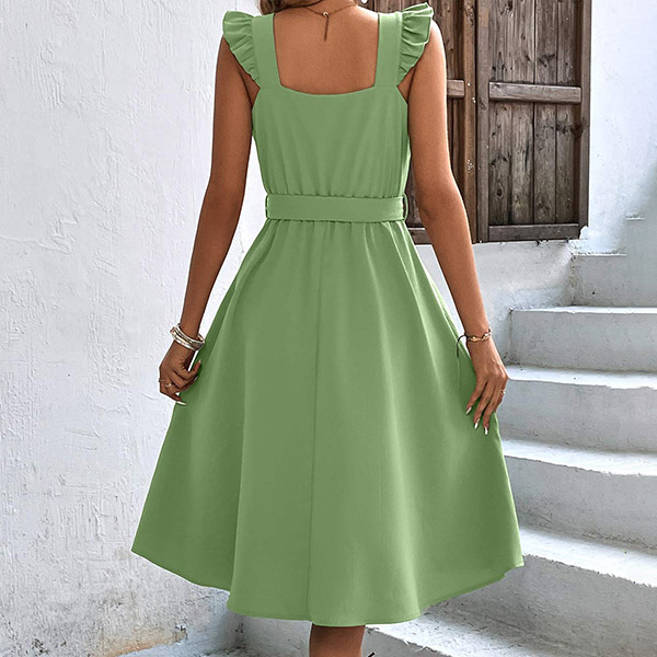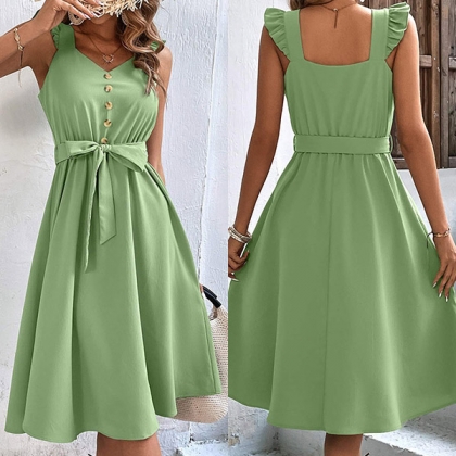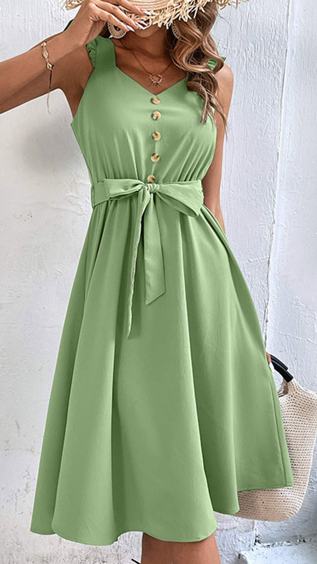 This tank dress features a V-neckline, button detailing, self-tie waist, and a beautiful green color for a trendy and chic look. Whether you're going for a casual day out, a work meeting, or a special occasion, this dress will make you feel effortlessly chic and on-trend.