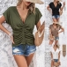 This shirt features a flattering V-neckline, delicate cap sleeves, a front drawstring detail for ruched effect, and a back lace spliced design, combining elegance, versatility, and a touch of romanticism in one stylish piece. Wanna have a try?