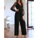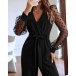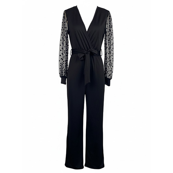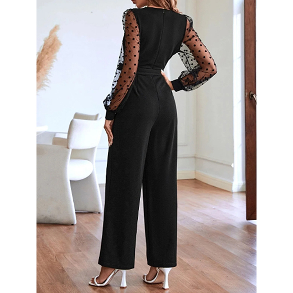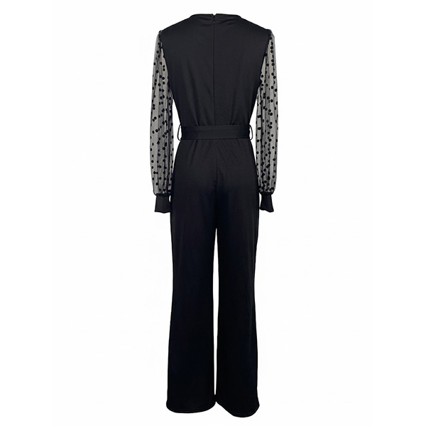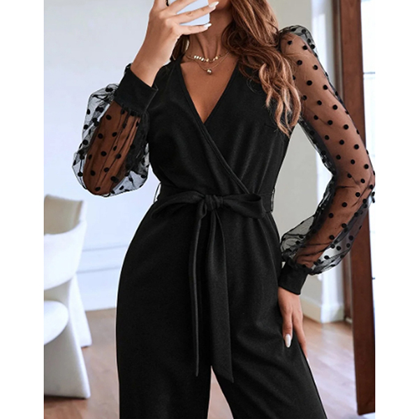Fashion V-neck Dot Printed Gauze Spliced Long Sleeve Self-tie Jumpsuit