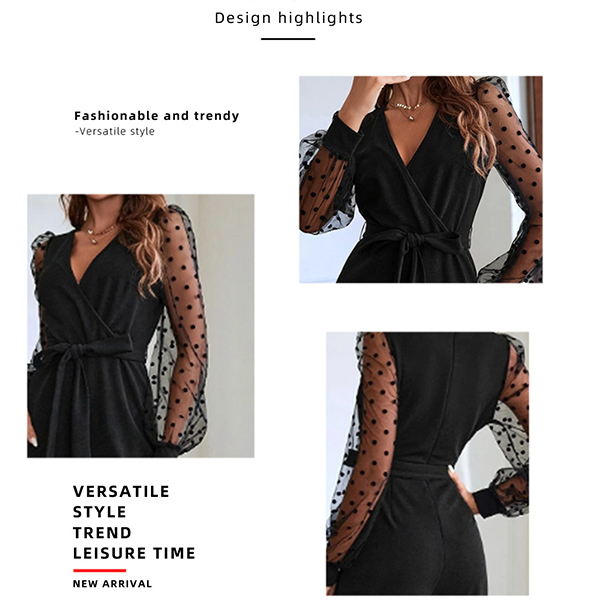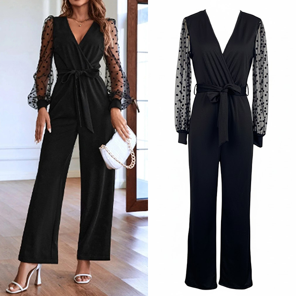 This charming jumpsuit features flattering V-neck styling with delicate gauze splicing long sleeve for contemporary feminine sophistication. The dot printed pattern along the long sleeve adds whimsical charm and timeless vintage-inspired sophistication. Wanna have a try?