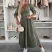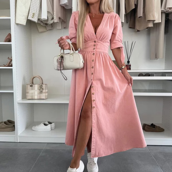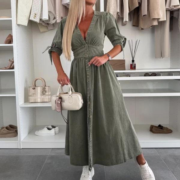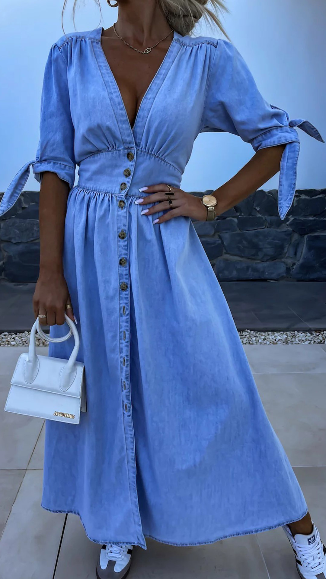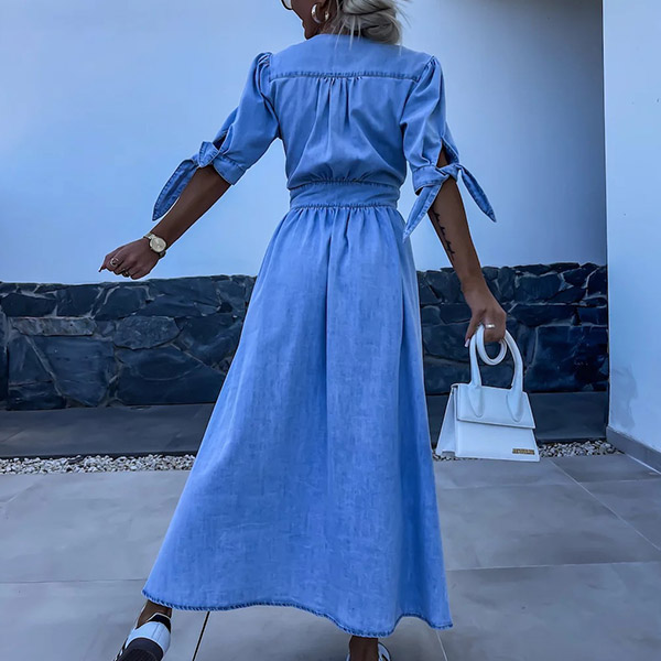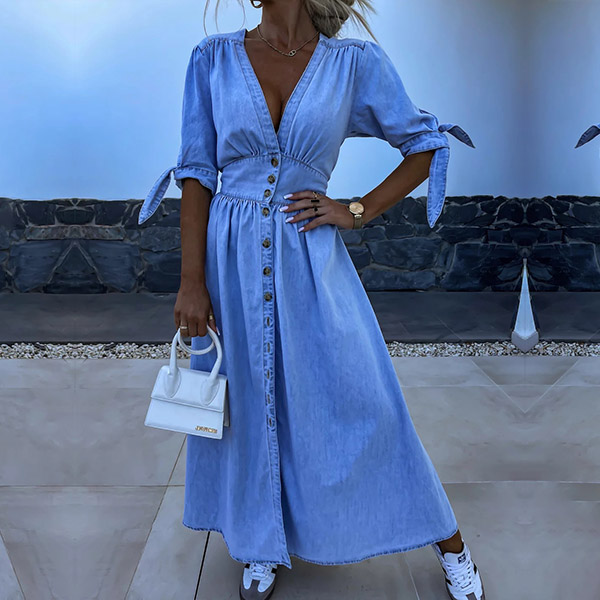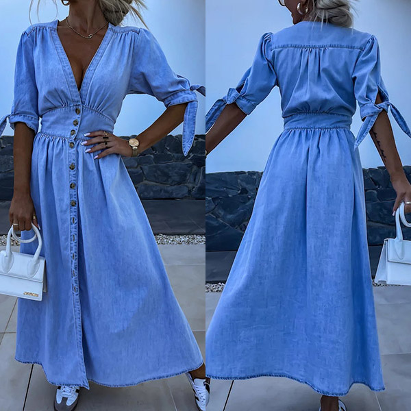 This dress combines the timeless appeal of denim with the elegance of a maxi silhouette, creating a fashionable and versatile ensemble that is perfect for various occasions. It features sexy V-neck, self-tie elbow sleeve, front button design, and maxi lenght, wanna have a try?