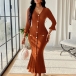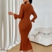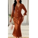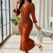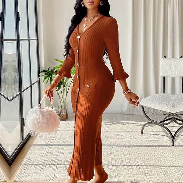 Fashion V-neck Elbow Sleeve Front Button Ribbed Midi Dress