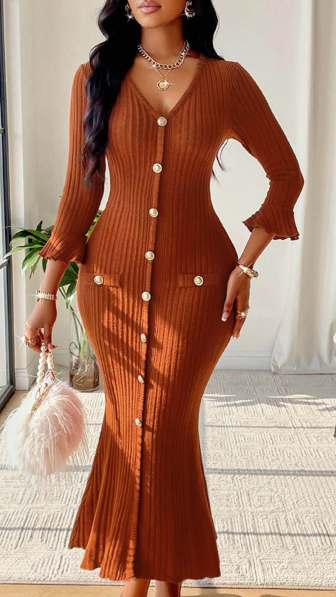 This chic and trendy dress features a flattering V-neckline and elbow-length sleeves for a sophisticated look. The front button detailing adds a touch of elegance and interest to the ribbed fabric, creating a stylish and modern silhouette. The midi length is perfect for a variety of occasions, from work to a casual outing or a lunch date with friends. Hope you like it.