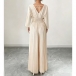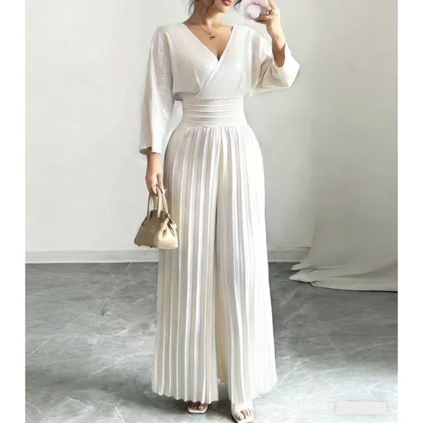 This sophisticated jumpsuit features elegant V-neck styling with modern elbow-sleeve construction and flattering high-rise pleated design for contemporary graceful elegance. Pair with sleek accessories and modern shoes for sophisticated contemporary appeal.