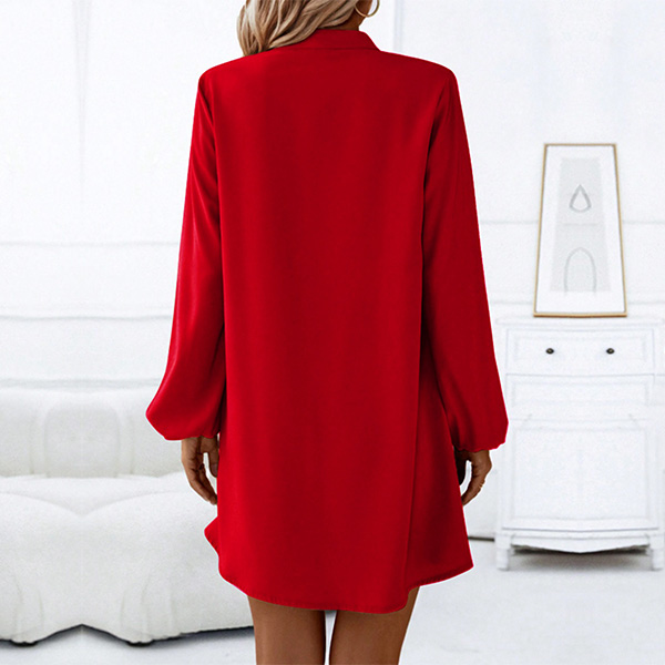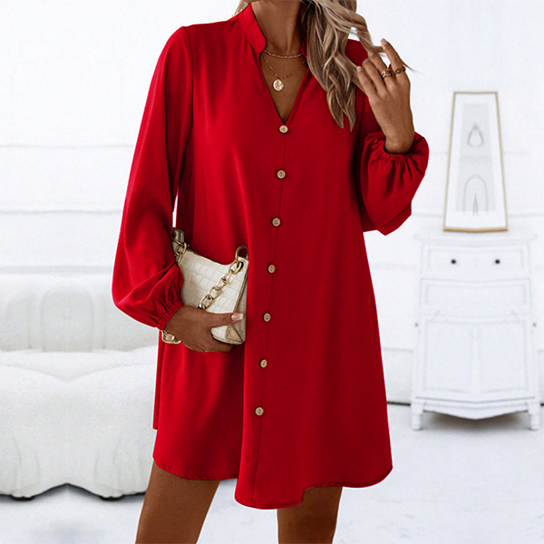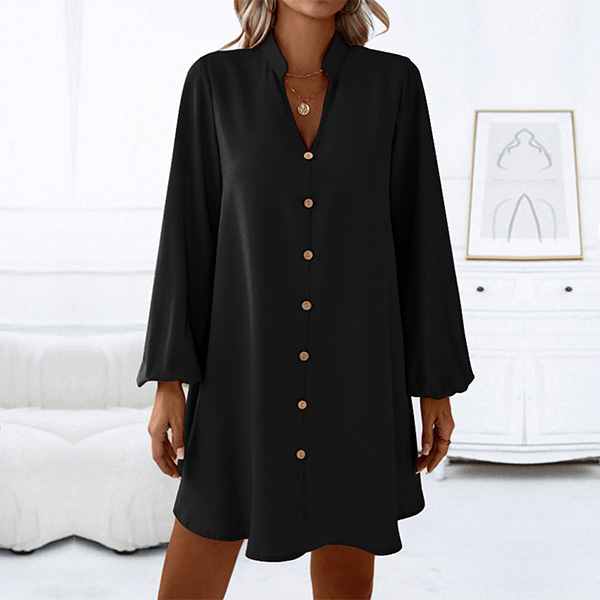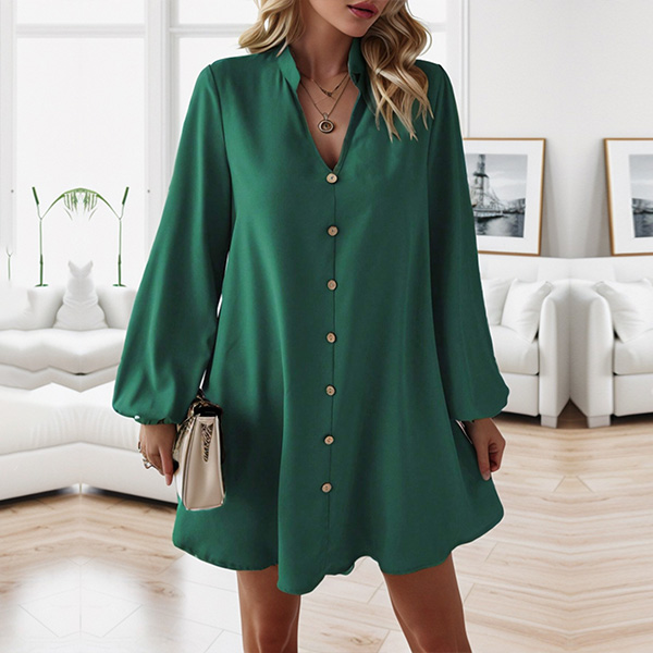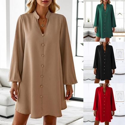 Fashion V-neck Front Button Long Sleeve Loose Dress