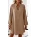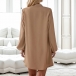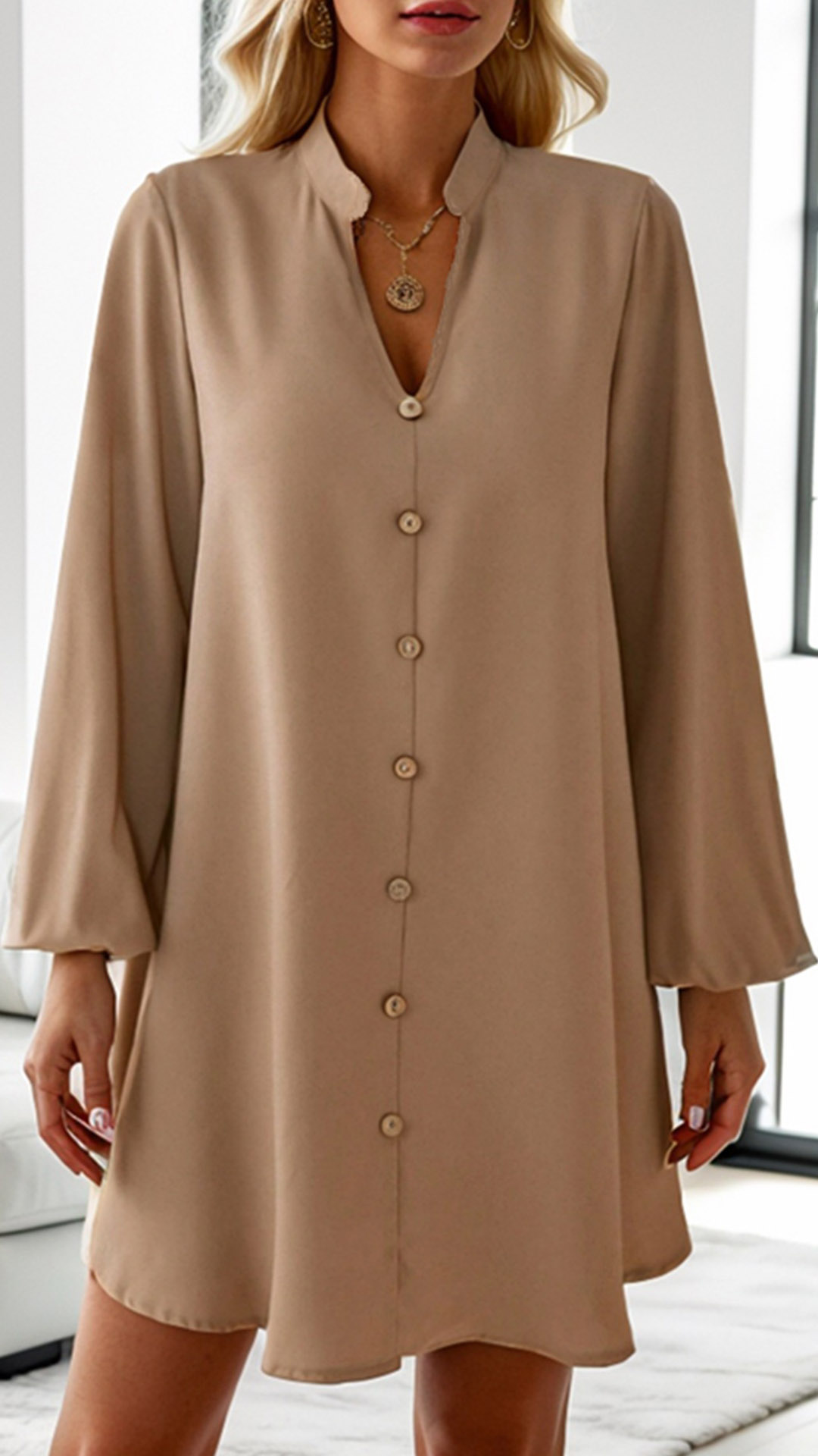 This dress features a flattering V-neckline, front button detailing, long sleeves, and a loose silhouette, creating a chic and comfortable ensemble.