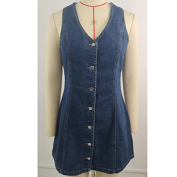 Fashion V-neck Front Button Sleeveless Old-washed Denim Dress