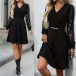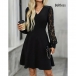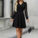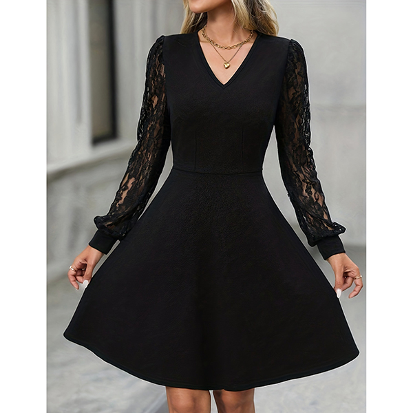 This black dress features contemporary fashion styling with elegant V-neck construction and luxurious lace splicing design for modern feminine sophistication. Perfect for daily wear.