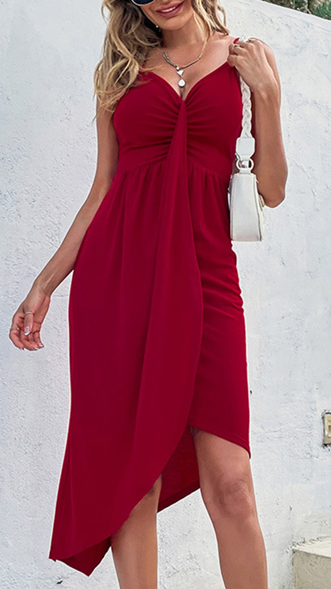 This red dress features a flattering V-neckline that accentuates your curves, while the irregular hemline adds a touch of edge and allure. Wanna have one?