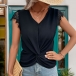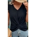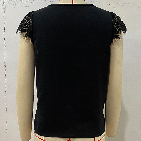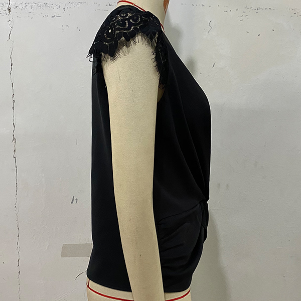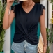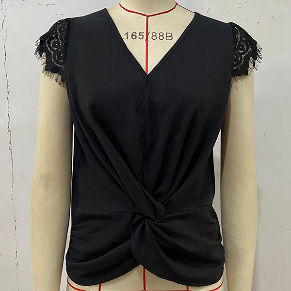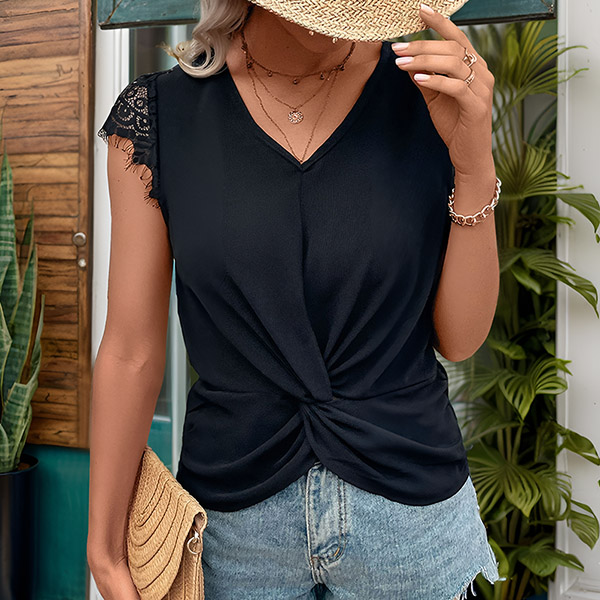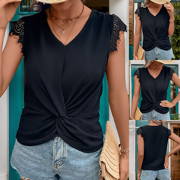 This black shirt features a V-neckline, lace detailing on the cap sleeves, and front knot design for a ruched effect, perfect for a chic and feminine look.