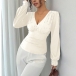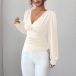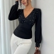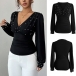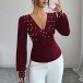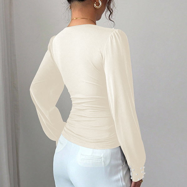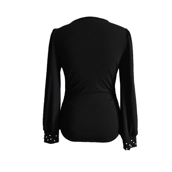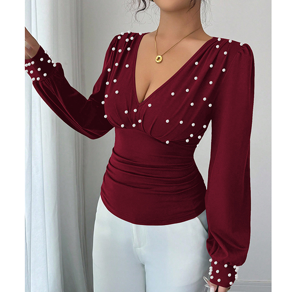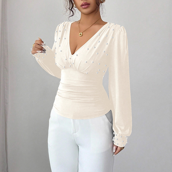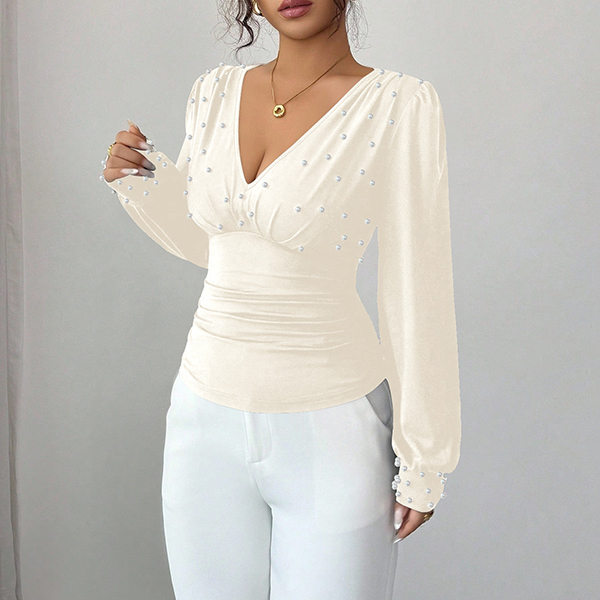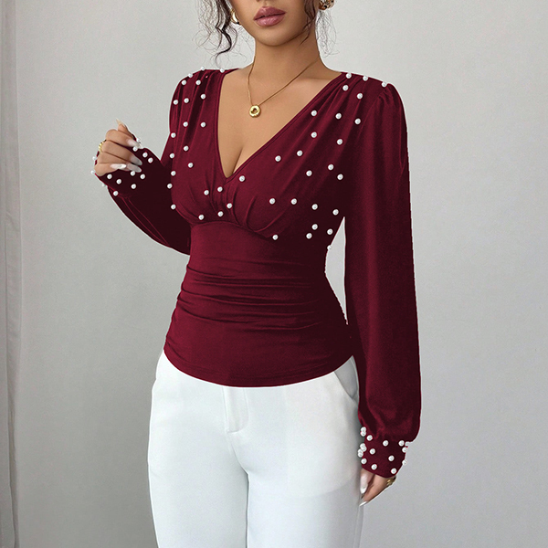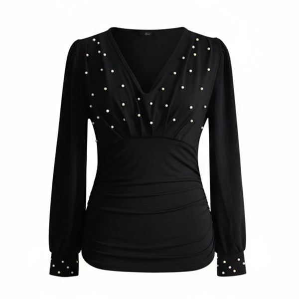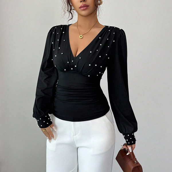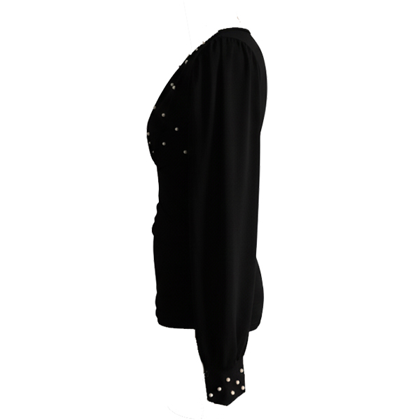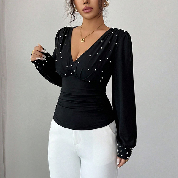 This elegant shirt features flattering V-neck styling with sophisticated bead embellishments and long sleeves for contemporary luxurious sophistication. Pair with tailored trousers and heels for elegant sophisticated appeal.