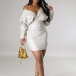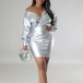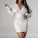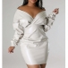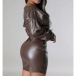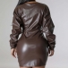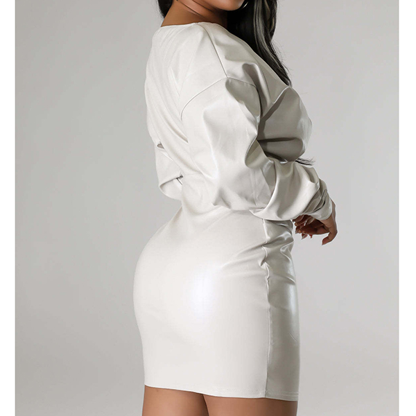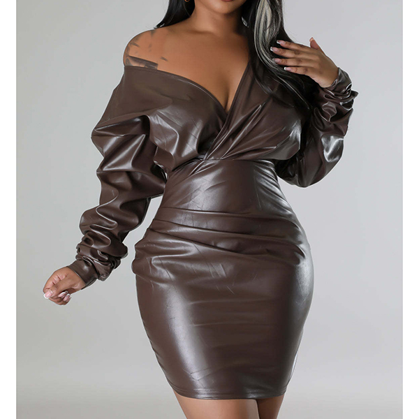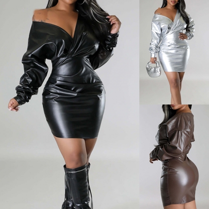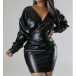 Fashion V-neck Long Sleeve Bodycon Artificial Leather PU Dress