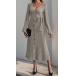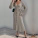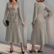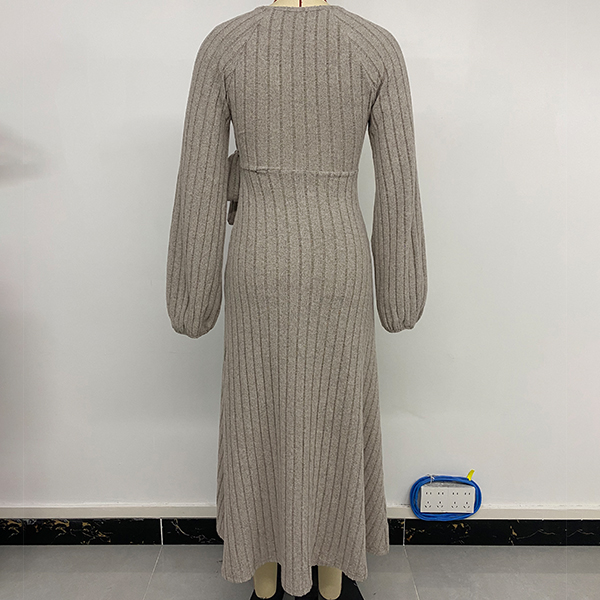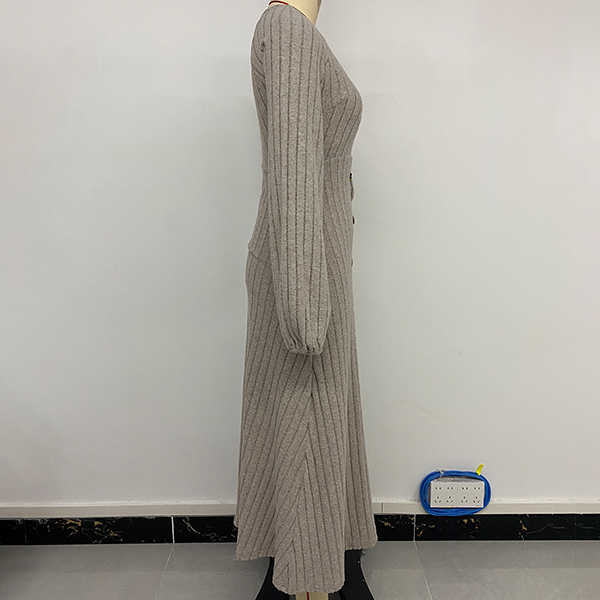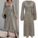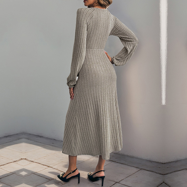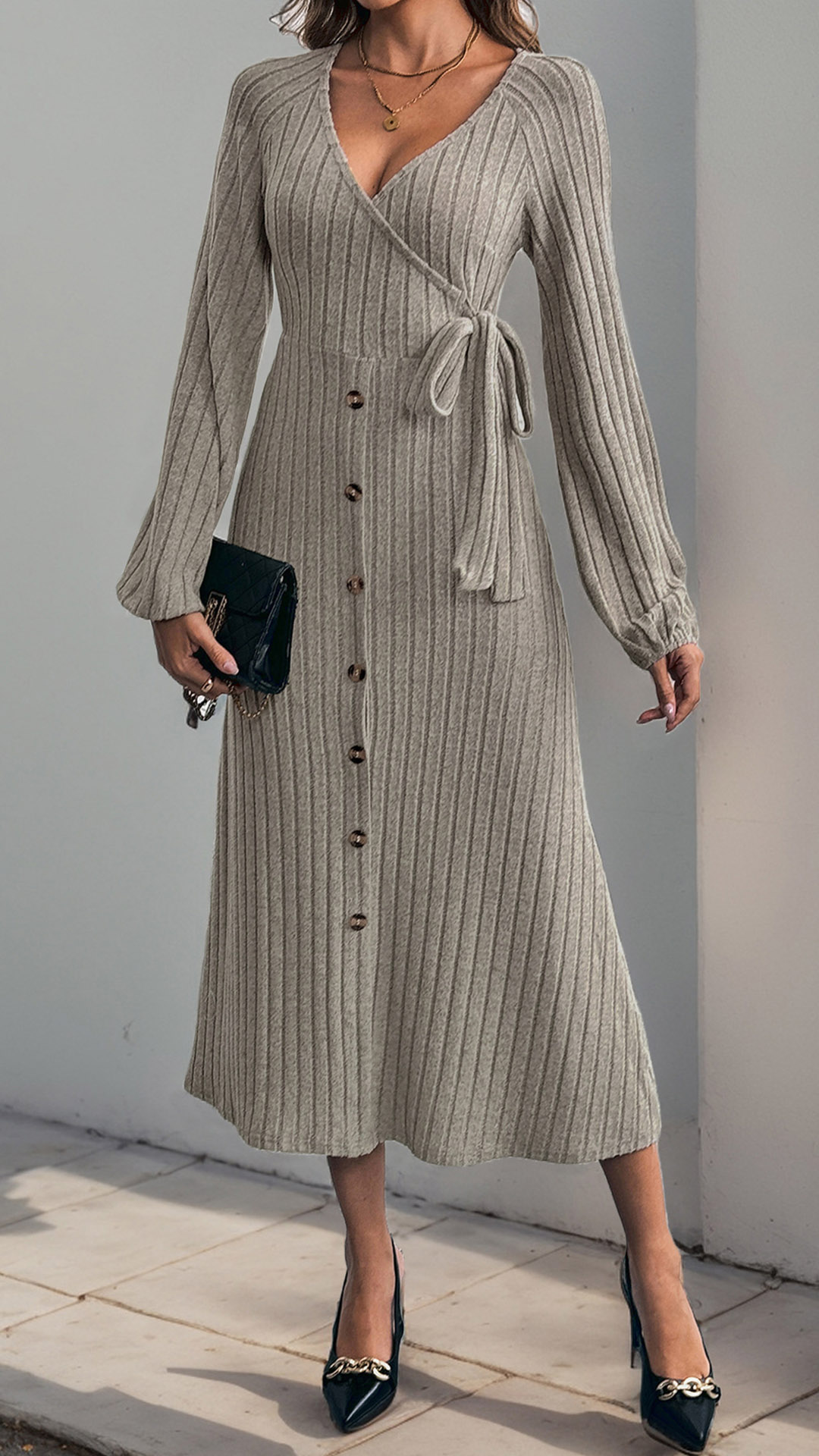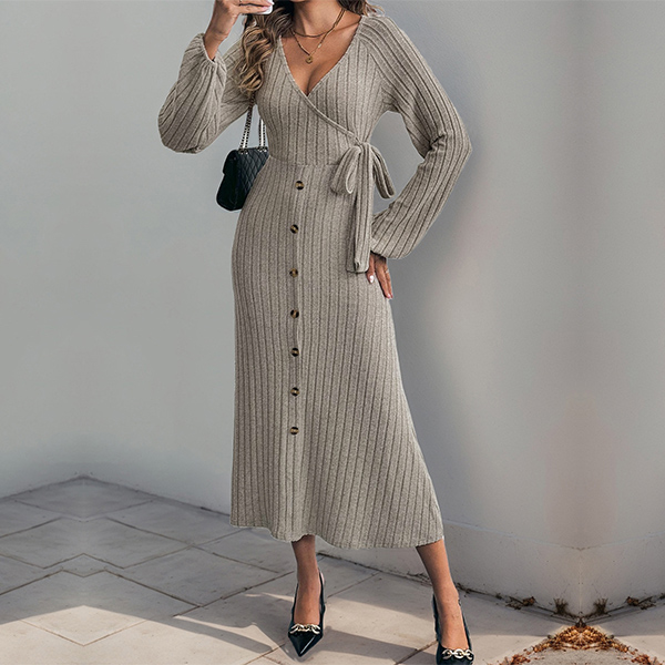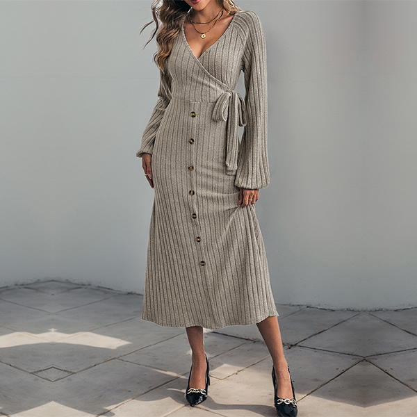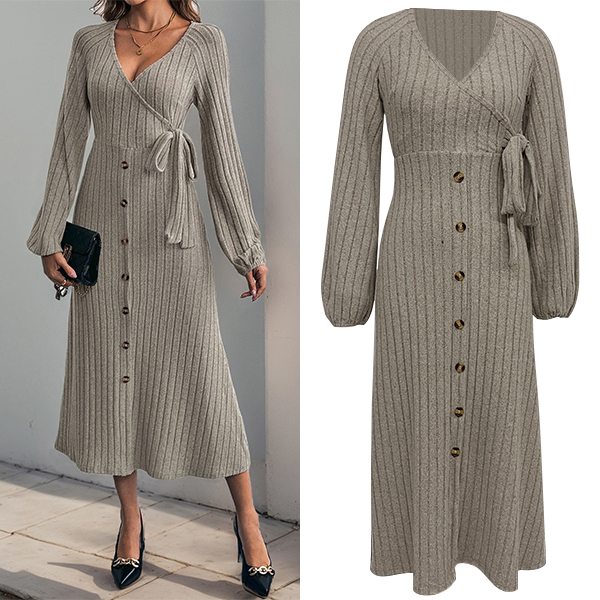 Fashion V-neck Long Sleeve Button Ribbed Wrap Dress