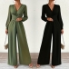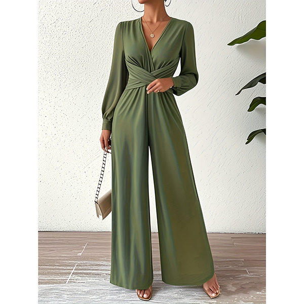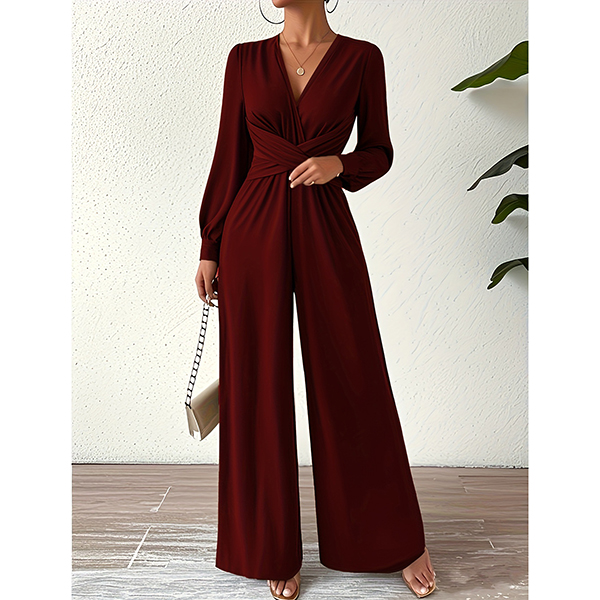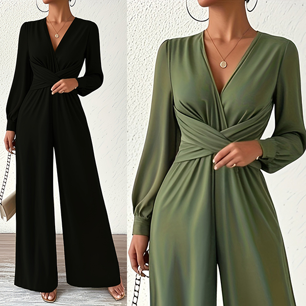 This jumpsuit features contemporary fashion styling with elegant V-neck construction and distinctive criss-cross design at the waist for modern refined sophistication. The V-neckline creates graceful décolletage enhancement with flattering appeal whilst the long sleeves add complete coverage and seasonal versatility throughout the flowing silhouette. Hope you like it.