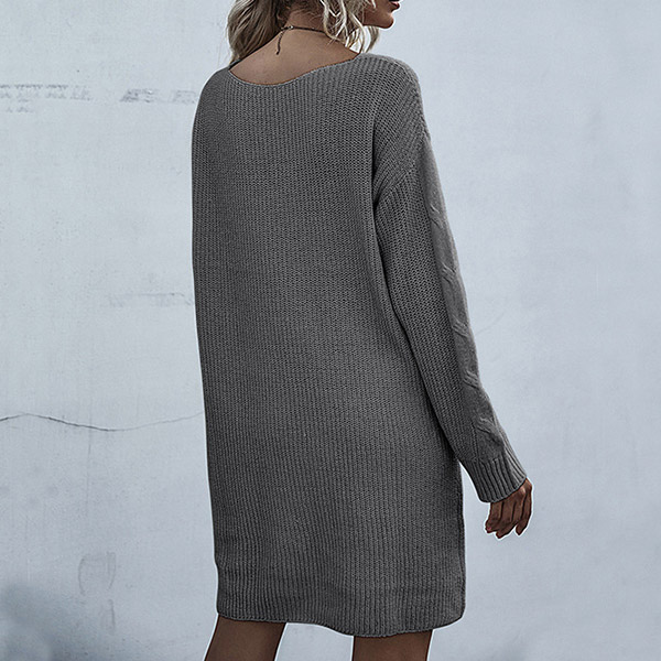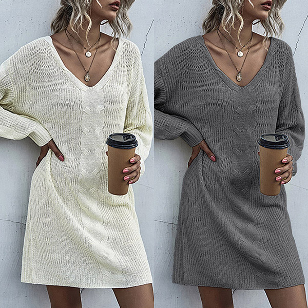 This is a stylish and cozy sweater dress that combines a V-neckline, long sleeves, and a knitted design for a fashionable and comfortable look.