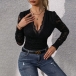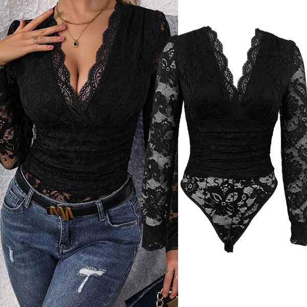 This lace bodysuit features a V-neckline, long sleeves, and a figure-hugging silhouette, creating a stylish and elegant look. Pair it with high-waisted pants or a skirt for a sophisticated and fashion-forward outfit.
