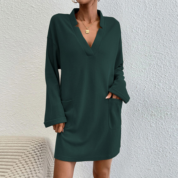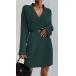 Fashion V-neck Long Sleeve Patch Pockets Mini Dress(without Belt)