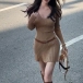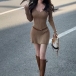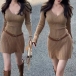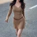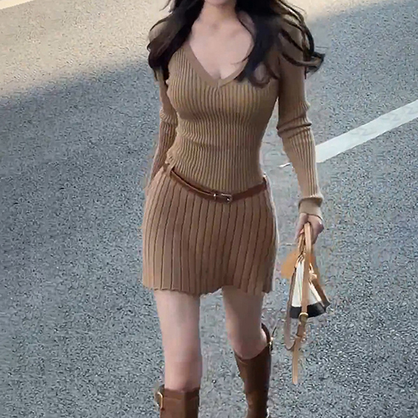 Fashion V-neck Long Sleeve Pleated Hemline Ribbed Dress