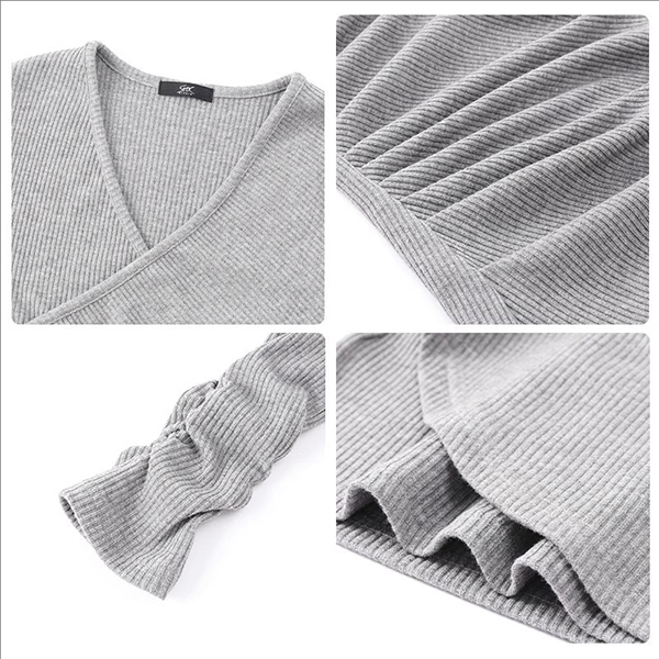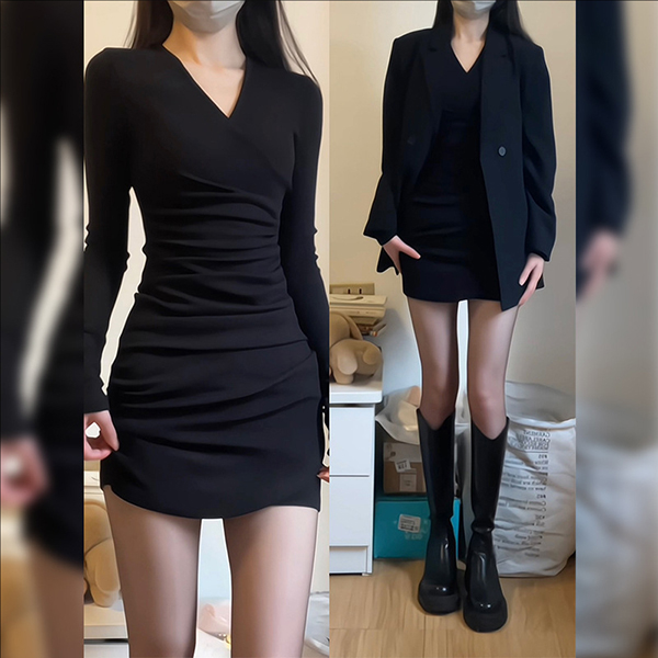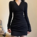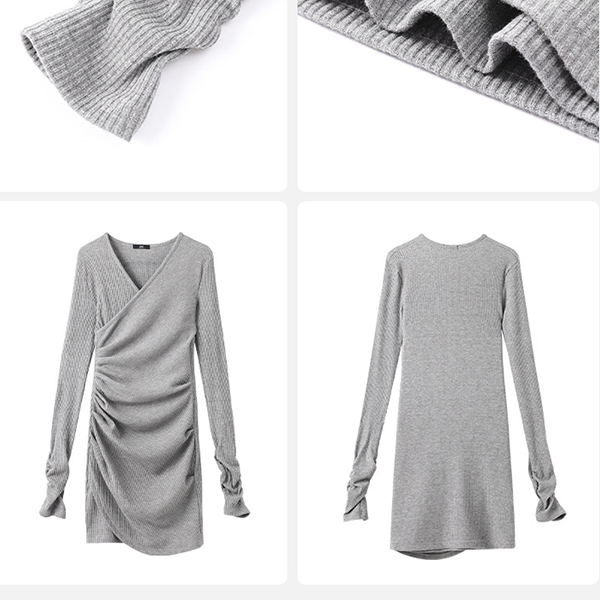 Fashion V-neck Long Sleeve Ruched Irregular Hemline Bodycon Dress