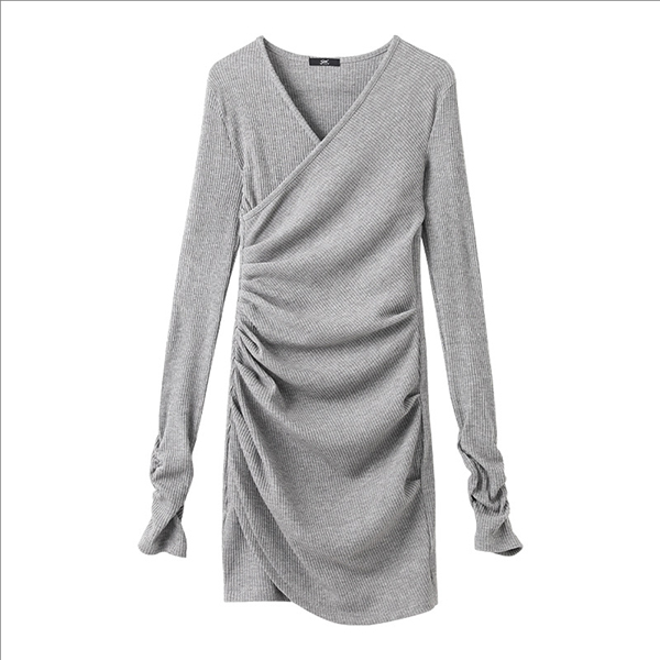 This gray dress features elegant V-neck styling with body-contouring bodycon construction, dynamic ruched details and irregular hemline for contemporary sculptural elegance. Wanna have one?