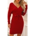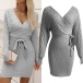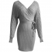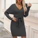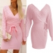 Fashion V-neck Long Sleeve Self-tie Knitted Sweater Dress