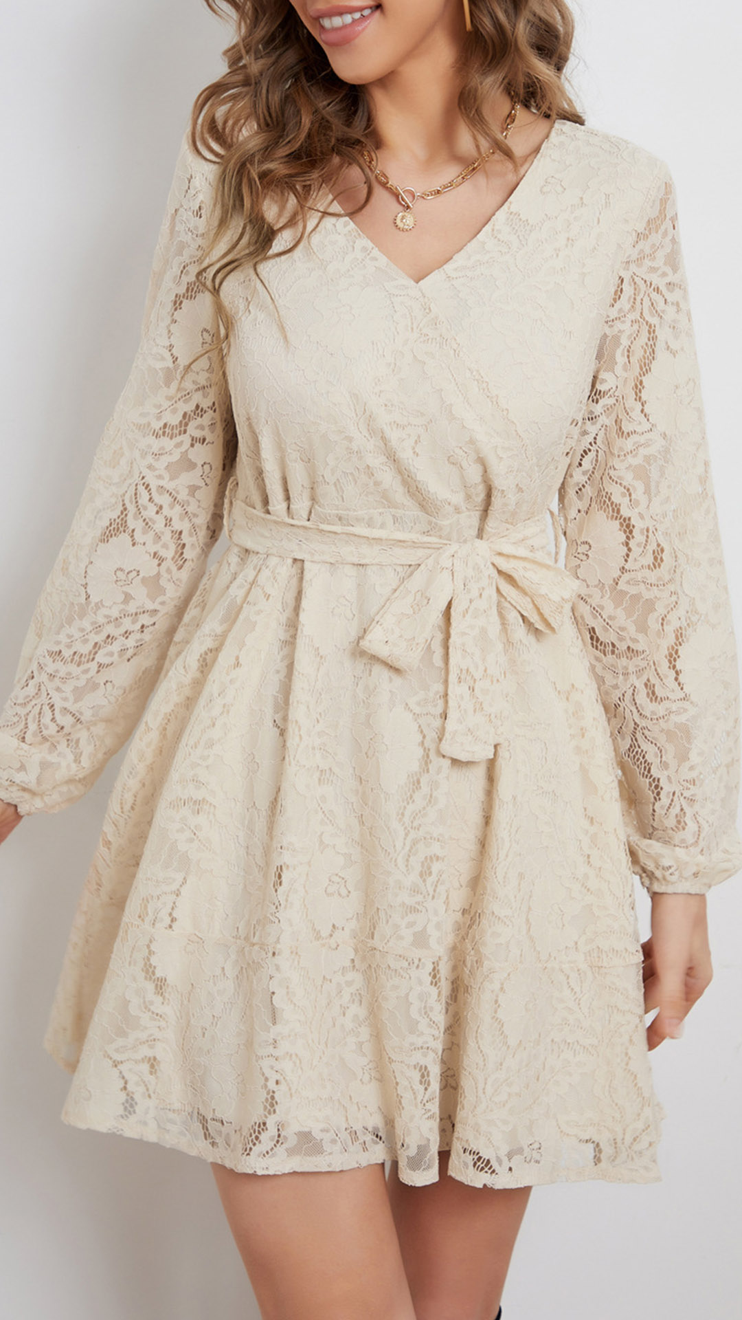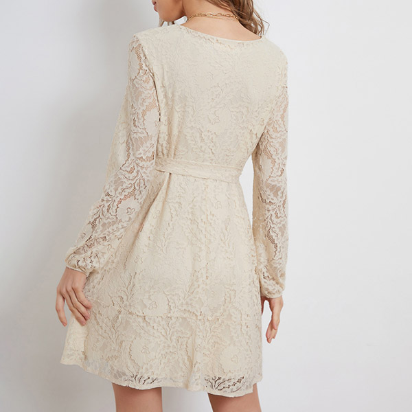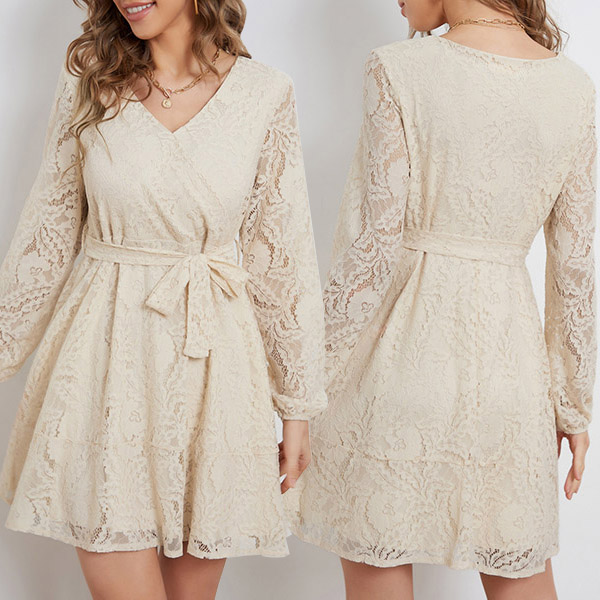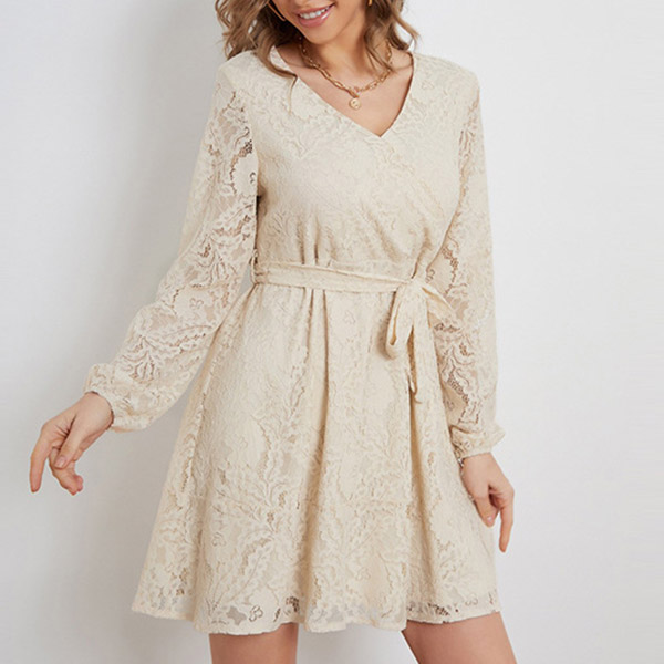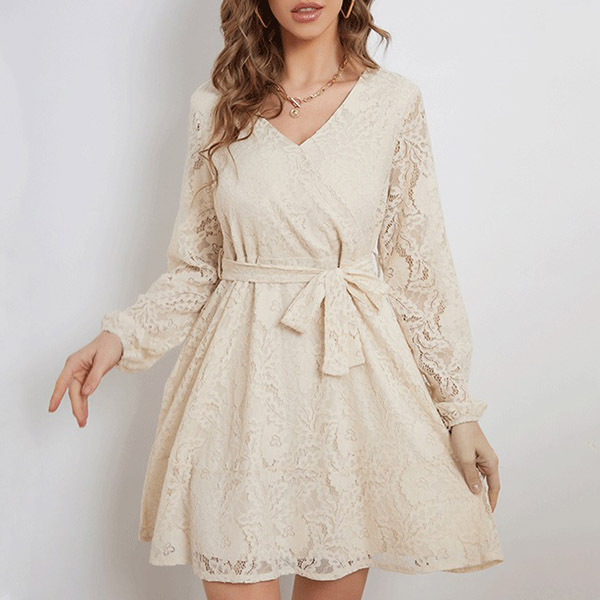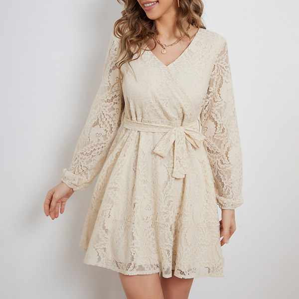 Fashion V-neck Long Sleeve Self-tie Lace Dress