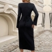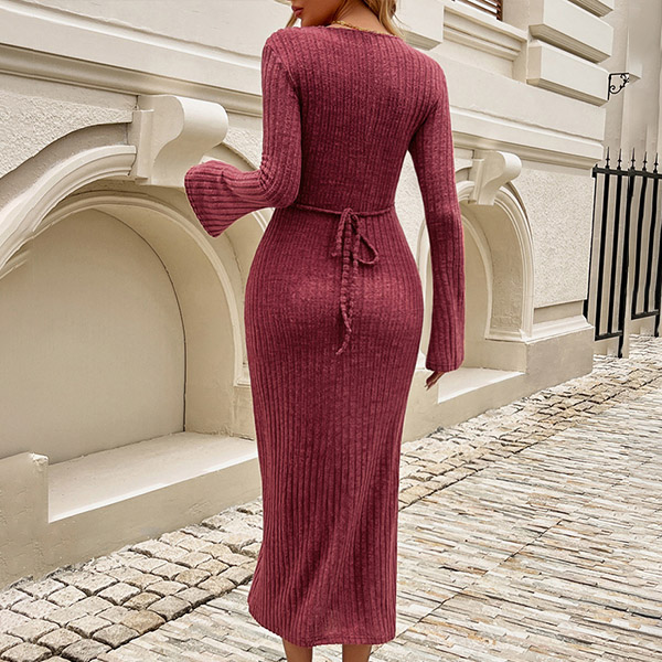 Fashion V-neck Long Sleeve Self-tie Ribbed Bodycon Dress