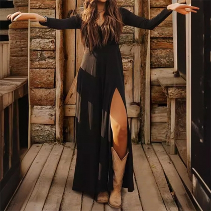 Fashion V-neck Long Sleeve Slit Maxi Dress