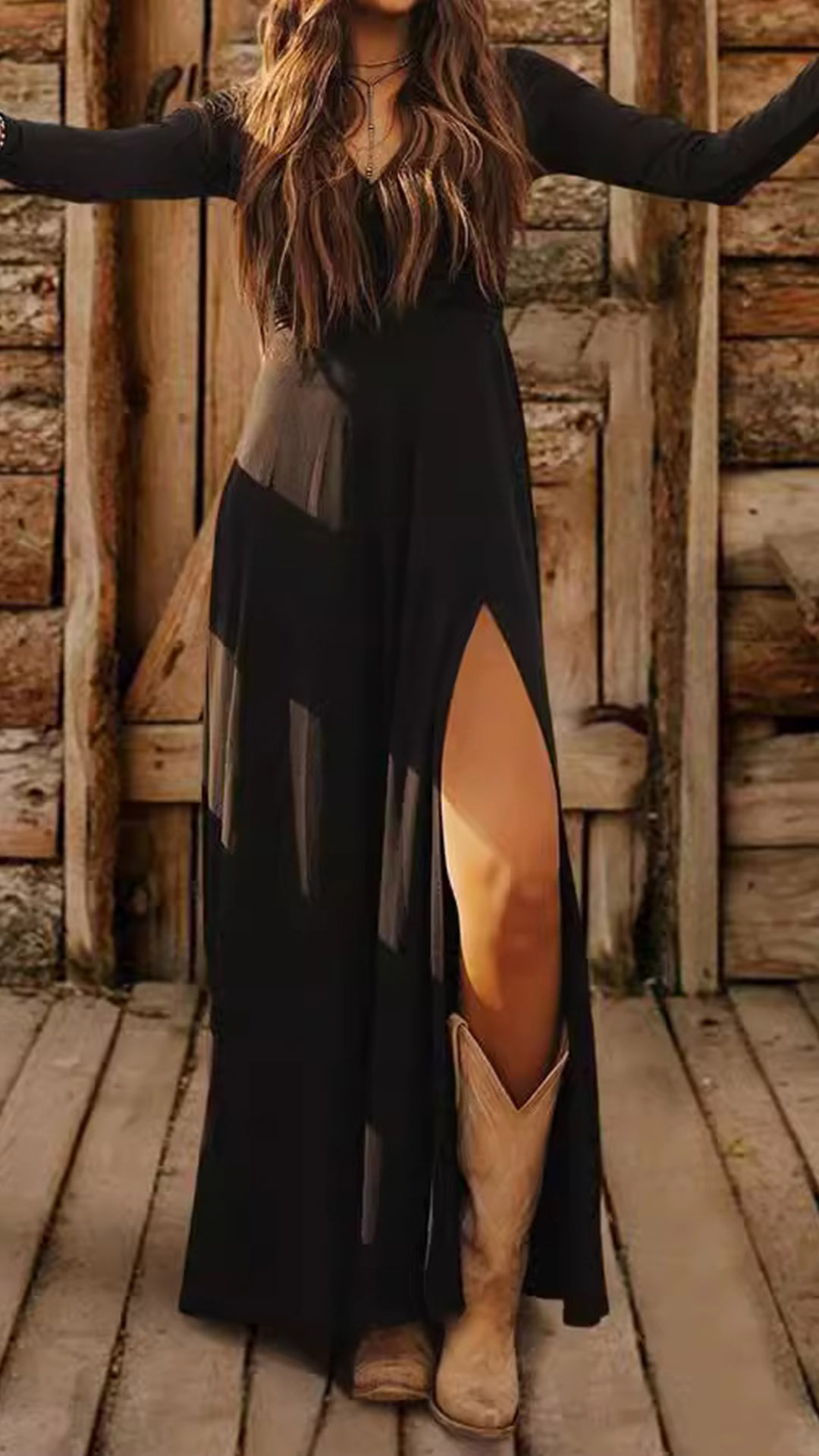 This maxi dress features a V-neckline, long sleeves, and a slit detail, creating an elegant and sophisticated look. Wanna have a try?