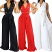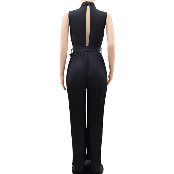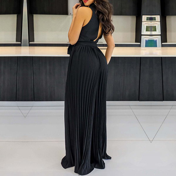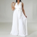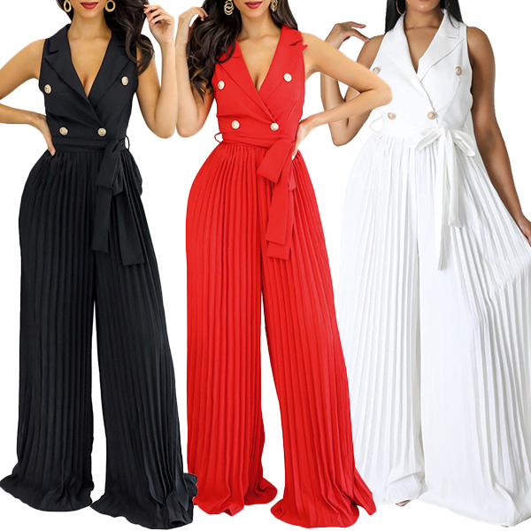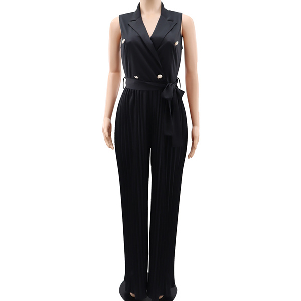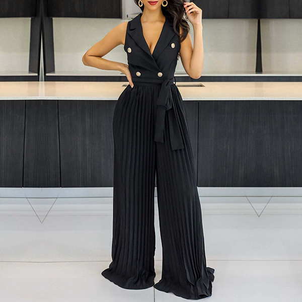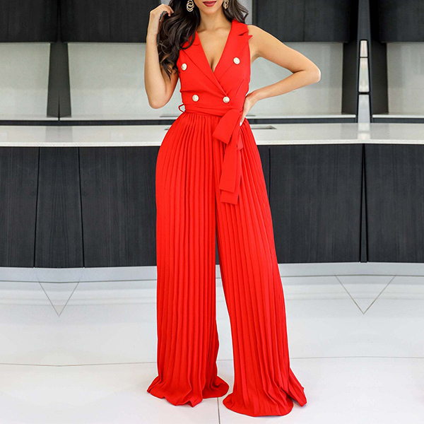 Fashion V-neck Notch Lapel Double Breasted Self-tie Pleated Wide-leg Jumpsuit