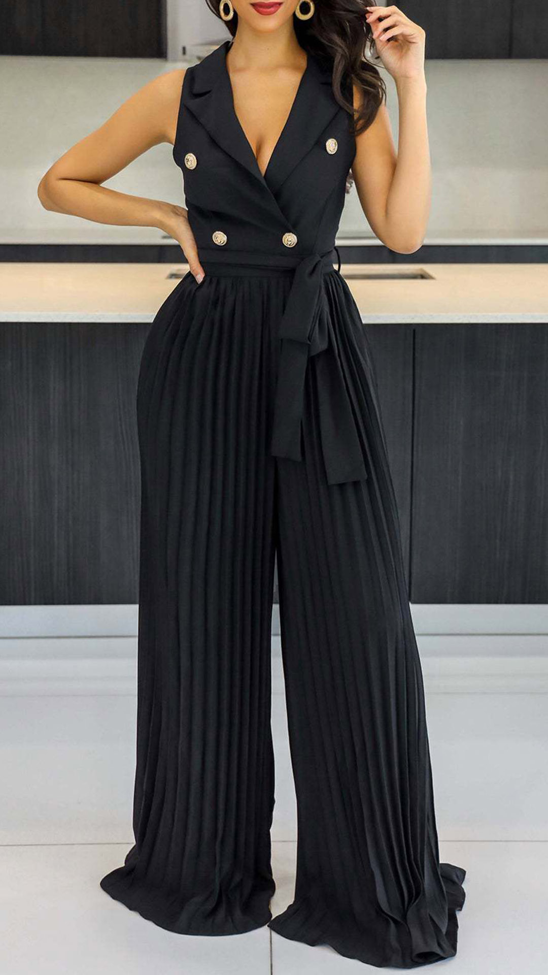 This jumpsuit features a V-neckline, notch lapel, double-breasted design, self-tie waist belt, pleated detailing on the wide-leg pants, creating a chic and sophisticated look. Wanna have a try?