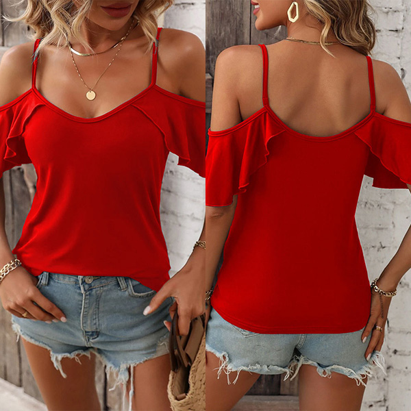 This casual shirt features a V-neckline, open-shoulder design, and short sleeves for a trendy and fashionable look. Pair it with jeans or shorts for a casual and laid-back look.