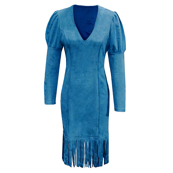 Fashion V-neck Puff Long Sleeve Fringe Hemline Faux Suede Bodycon Dress