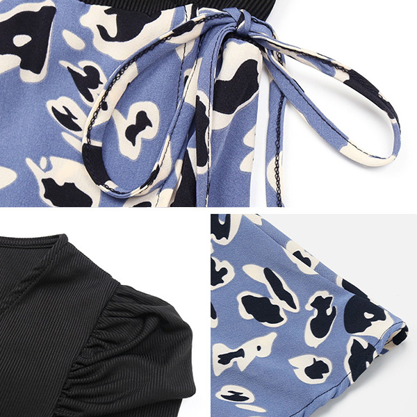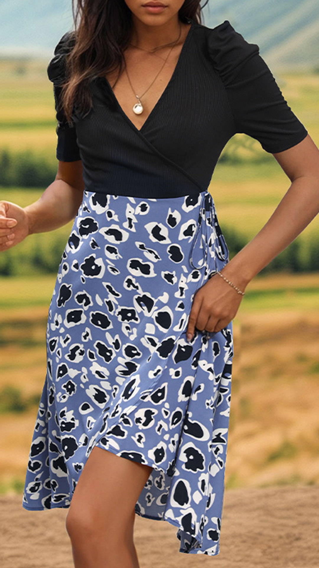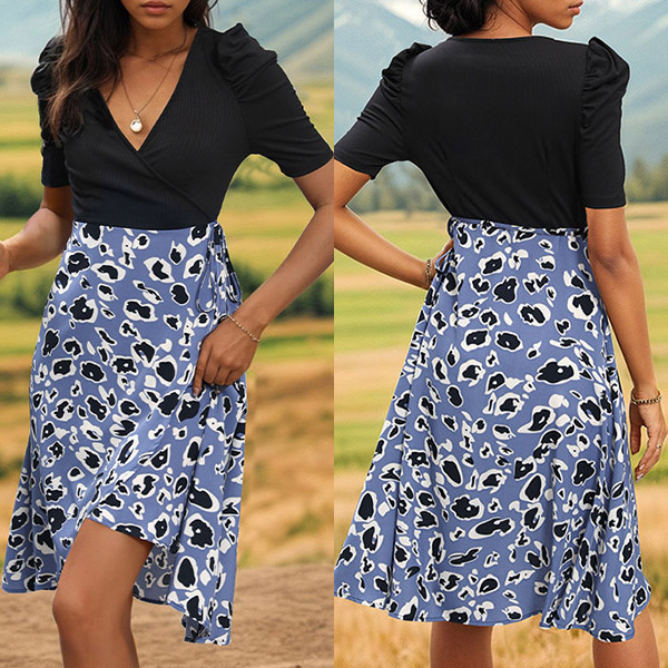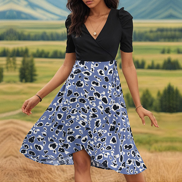 This wrap dress combines a black bodice and cow pattern skirt! It is chic and stylish! Pair it with sandals or sneakers for a trendy and laid-back look!