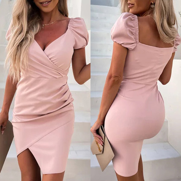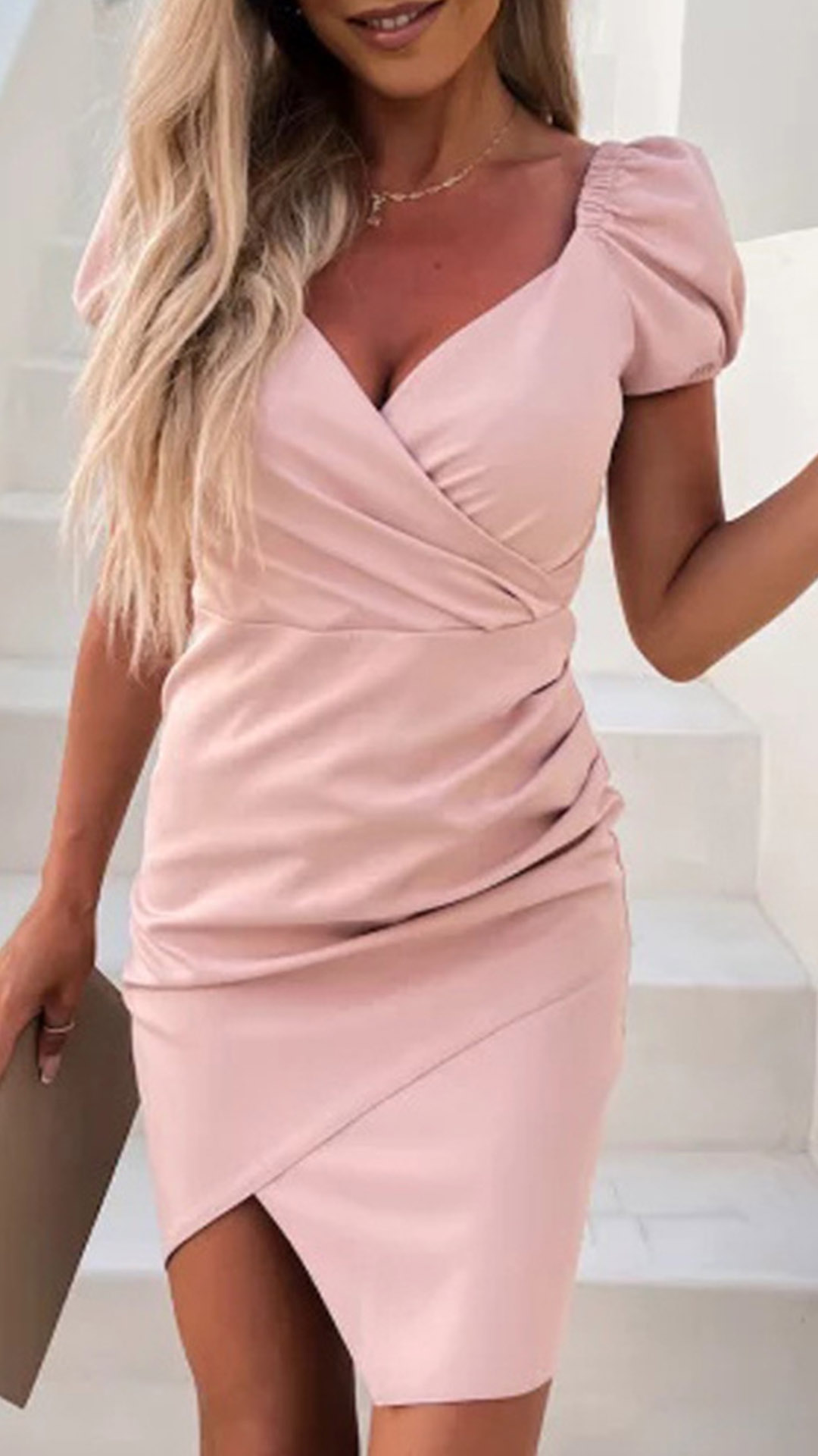 This pink dress features puff short sleeve, sexy wrap V-neck design, ruched details and slit skirt, slim fit silhouette. Is it your style?