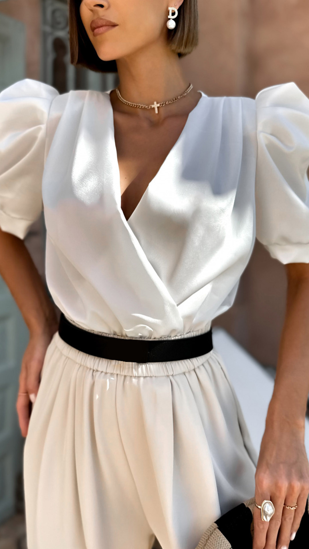 This stylish, elevated blouse features a sophisticated v-neckline and on-trend puff short sleeves. Crafted from a lightweight, breathable fabric, this blouse offers all-day comfort and ease of movement.