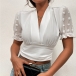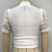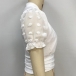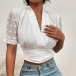 This fashionable and stylish shirt is perfect for any woman who wants to feel beautiful and confident. The V-neck design is both flattering and stylish, while the puff short sleeves add a touch of elegance. The 3D floral design on the semi-through short sleeve is eye-catching and unique, making this shirt a must-have.